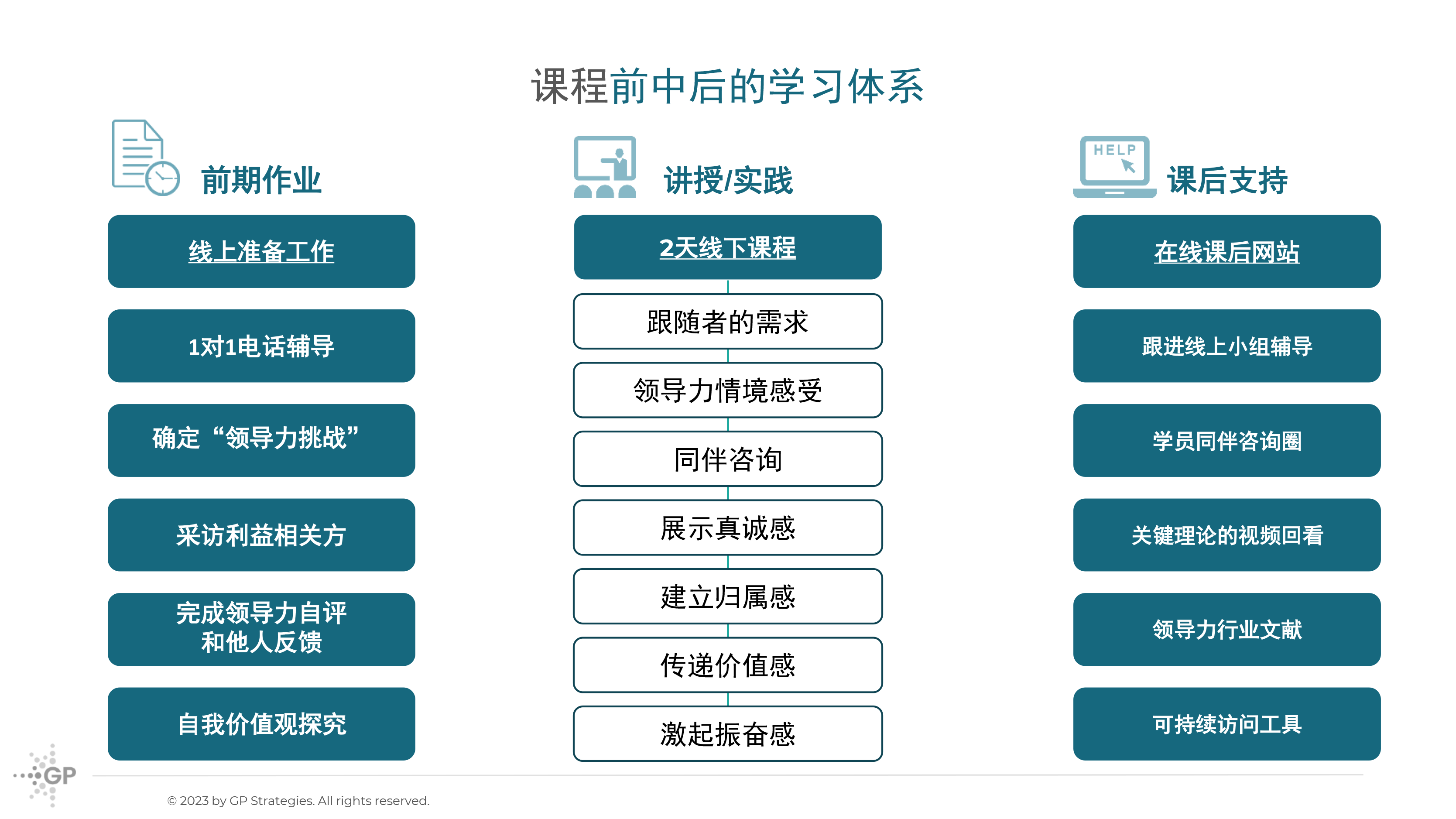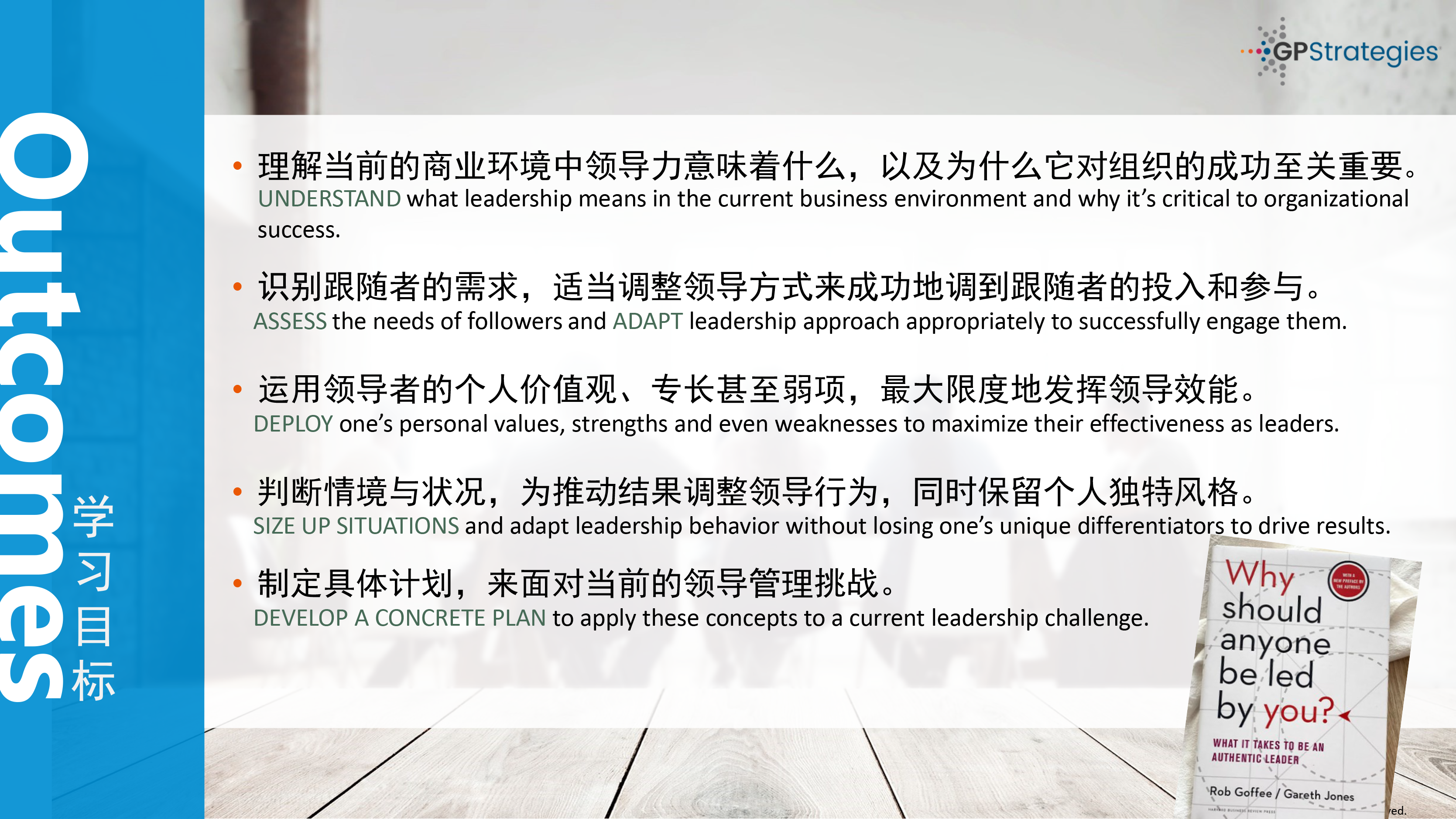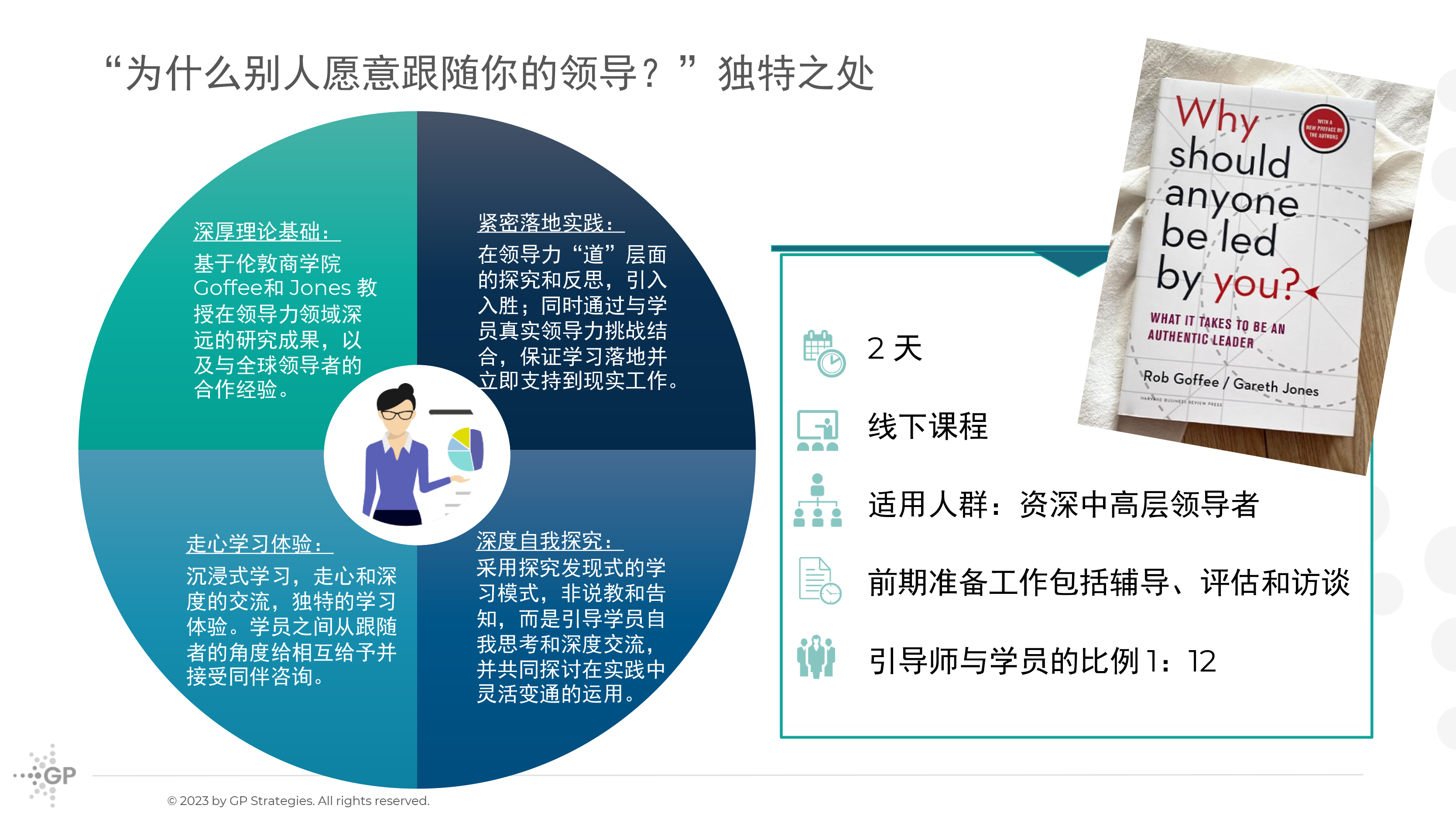 “为什么别人愿意跟随你的领导”,这门课程来自GP Strategies的版权课程,源于两位教授Rob Goffee与Gareth Jones四十多年来对领导力研究,课程有深厚理论根基、走心的学习体验、深度自我探究、紧密落地实践等特点,对资深中高层领导者帮助极大。